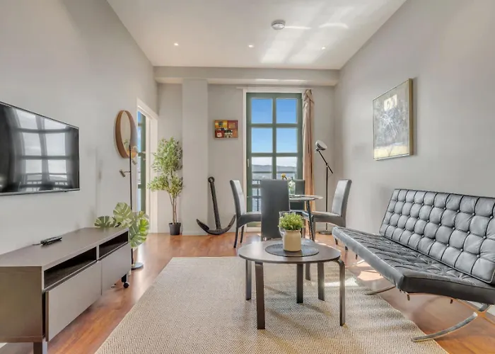 该拥有1间卧室的Heimby - Seaside View Luxury - Free Parking公寓公寓方便客人前往布吕根海尼赛提克码头.